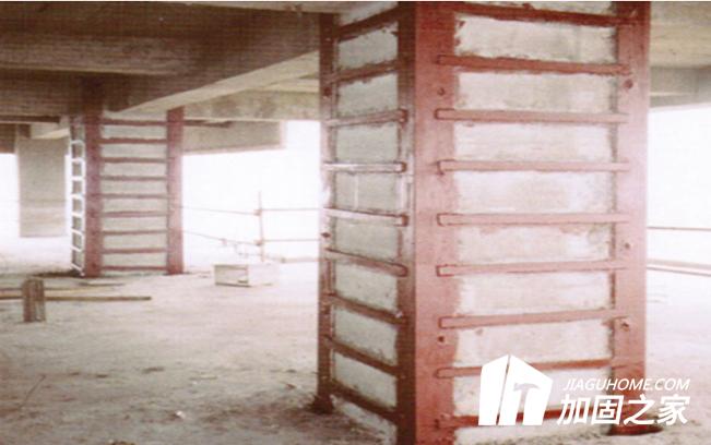 該技術(shù)是將角鋼、鋼板箍通過(guò)膠栓和灌注高強(qiáng)無(wú)機(jī)粘結(jié)材料與原混凝土柱可靠地連結(jié)成一個(gè)整體,該方法在新增角鋼截面提高柱子承載力的同時(shí),還因新增鋼板箍的橫向約束作用,使原混凝土柱產(chǎn)生良好的三軸應(yīng)力狀態(tài),因而可以大幅度提高柱子的承載力。